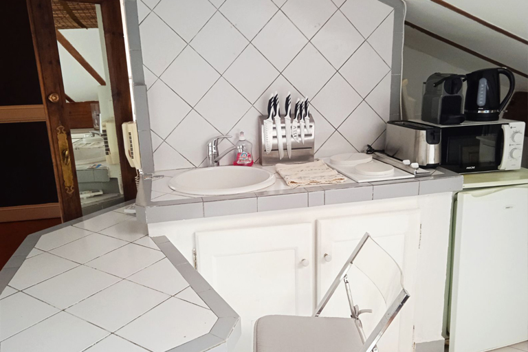 La cuisine vous permettra de cuisiner ou de réchauffer vos plats avec les 2 plaques et le four micro-ondes.