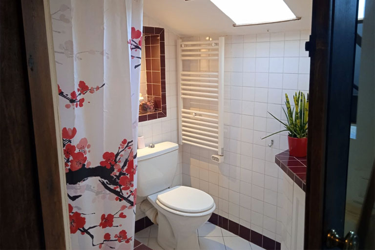 Jolie salle de bain fonctionnelle. WC standard avec tout à l’égout et un vélux pour garantir la ventilation.